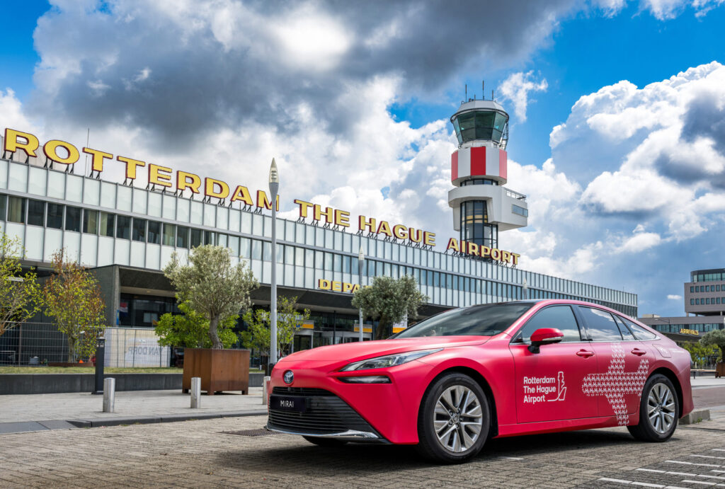 Na letišti Rotterdam/Haag nově jezdí vodíková Toyota Mirai. Vůz v červené barvě bude sloužit pro potřeby letištního personálu v areálu letiště. To také staví vodíkovou čerpací stanici, kterou budou moci využívat vozidla poháněná tímto palivem.